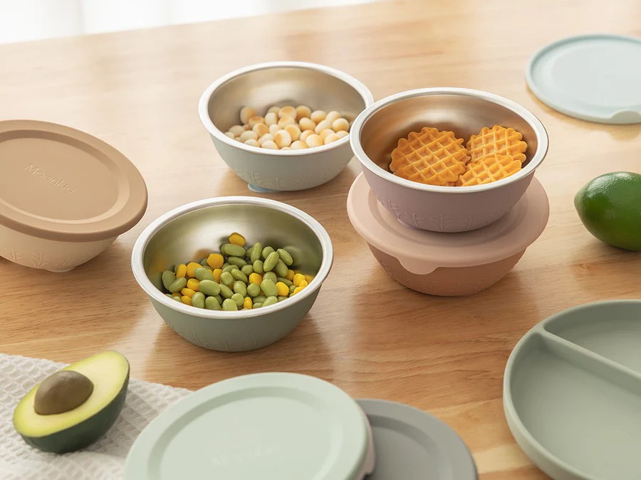 Set aus zwei Edelstahl-Schüsseln mit Silikon-Saugfuß und Deckeln. Der Saugfuß sorgt für stabilen Halt auf glatten Oberflächen. Hergestellt aus 304 lebensmittelechtem Edelstahl und lebensmittelechtem Silikon, geeignet ab 4 Monaten für Füttern und Aufbewahrung.